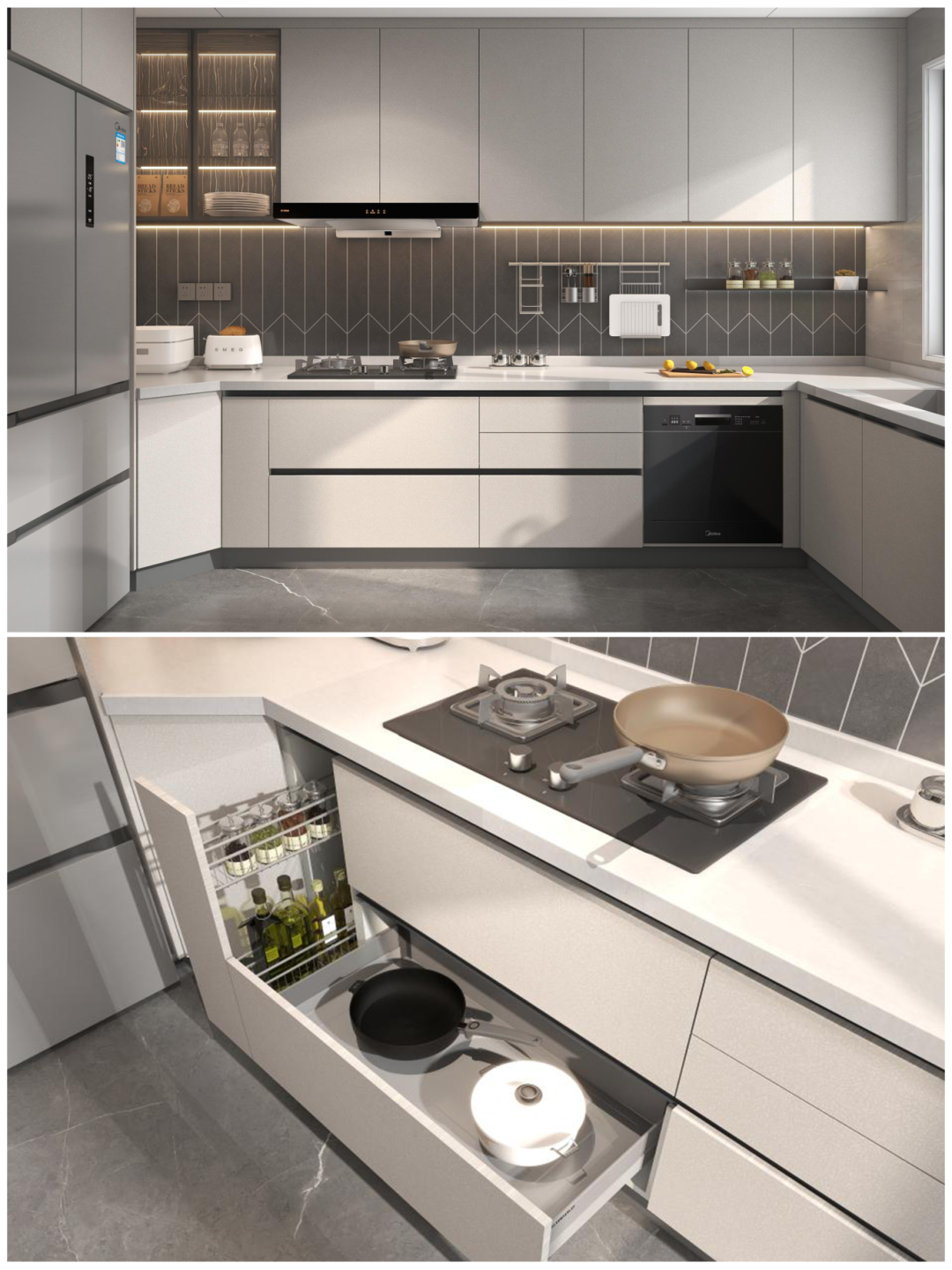 空間利用(yong)率高(gao),轉角設(shè)計(ji)形成(cheng)洗切炒黃金三角動(dòng)線(xiàn)📐可(kě)利用(yong)轉角櫃安(an)裝(zhuang)旋轉拉籃或飛碟拉籃,提升收納能(néng)力(li)