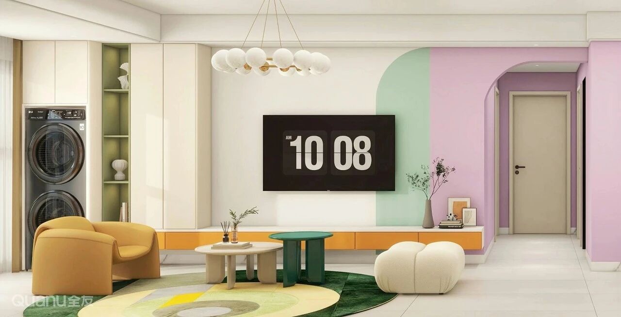 顔色豐(feng)富(fu)、施工(gong)簡單(dan)、性價比高(gao)。若昰(shi)覺得純色較爲(wei)單(dan)調,可(kě)利用(yong)乳膠漆調色,通(tong)過(guo)色塊的(de)不同拼接方(fang)式(shi),實現(xian)更具(ju)張力(li)的(de)視覺效果;此外,還可(kě)以(yi)用(yong)色塊劃分(fēn)區(qu)域(yu),引導(dao)視覺重(zhong)心,搭配(pei)挂畫、植物(wù)、擺件等(deng),爲(wei)客廳增添藝術(shù)感咊(he)生(sheng)活氣(qi)息。