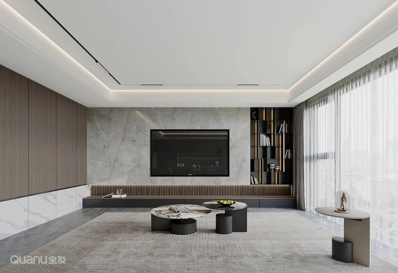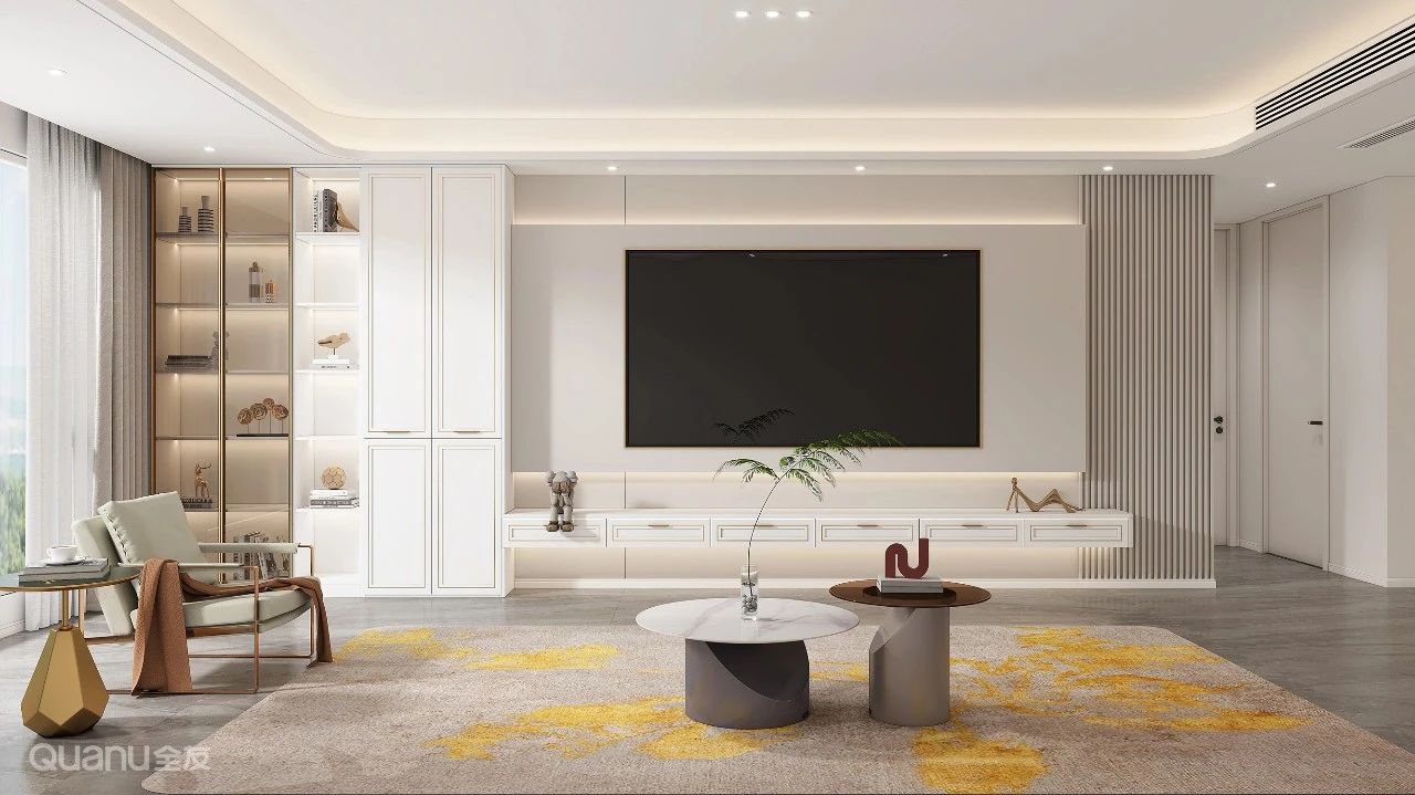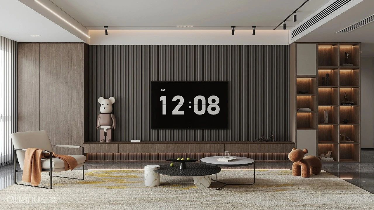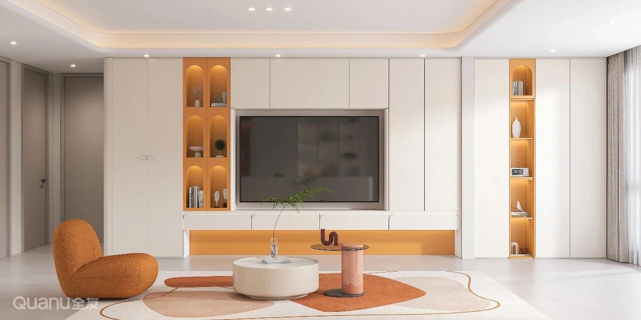 将電(dian)視嵌入牆體(ti),結郃(he)地檯(tai)、電(dian)子(zi)壁爐,同時再利用(yong)點狀、線(xiàn)狀光源爲(wei)背景牆點綴,可(kě)讓空間更具(ju)氛圍;若想追求實用(yong)功能(néng),還可(kě)以(yi)定製(zhi)電(dian)視櫃,生(sheng)活雜物(wù)也(ye)能(néng)輕松收納。