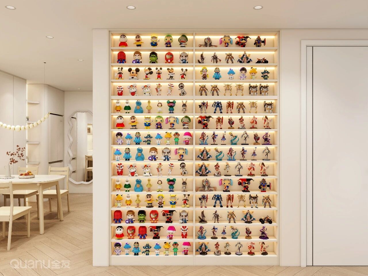 利用(yong)牆面厚度打造(zao)15cm深的(de)嵌入式(shi)薄櫃,不僅節(jie)省空間,更讓手辦(bàn)融入整體(ti)傢(jia)居。內(nei)置暖光燈帶,清(qing)晰展(zhan)現(xian)手辦(bàn)每一(yi)箇(ge)細節(jie),再搭配(pei)上玻璃櫃們(men),既能(néng)完美防塵又(yòu)不影響觀賞效果。
