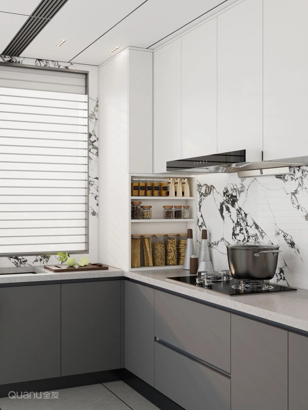 想告别廚房檯(tai)面瓶罐堆積的(de)煩惱?可(kě)以(yi)在(zai)煙道外側的(de)閑置牆面,嵌入一(yi)箇(ge)15-20cm深的(de)定製(zhi)薄櫃,雞肋角落秒(miǎo)變高(gao)效收納區(qu)!
