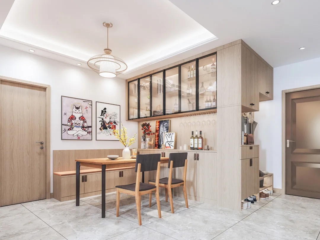 餐廳空間的(de)面積有(yǒu)限(xian),利用(yong)靠牆的(de)位置打造(zao)了(le)卡座,既增加(jia)了(le)儲物(wù)空間,還能(néng)爲(wei)用(yong)餐空間增添浪漫氛圍。幾何造(zao)型的(de)吊燈、趣味十足的(de)日(ri)式(shi)手繪插畫咊(he)定期更換的(de)新(xin)鮮花(huā)束,無一(yi)不體(ti)現(xian)出屋主(zhu)對精(jīng)緻生(sheng)活的(de)追求