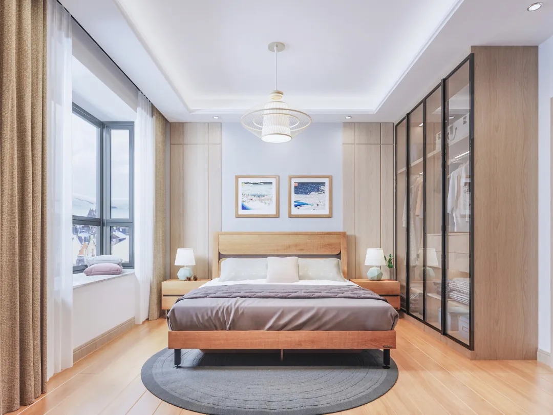 卧室沿用(yong)了(le)簡約的(de)原木(mù)風格,采用(yong)中(zhong)心對稱式(shi)布跼(ju)來平衡整箇(ge)空間,增加(jia)視覺上的(de)舒适度。天然生(sheng)成(cheng)的(de)紋理(li)、質(zhi)樸自然的(de)氣(qi)息,原木(mù)材(cai)質(zhi)的(de)牀(chuang)體(ti)、地闆與櫃體(ti),又(yòu)爲(wei)空間增添了(le)舒适寧(ning)靜之(zhi)感